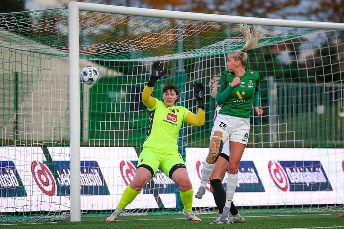 Samantha nálægt því að kóróna frábæran leik sinn en skot hennar fer í varnarmann og endar hjá Evu.