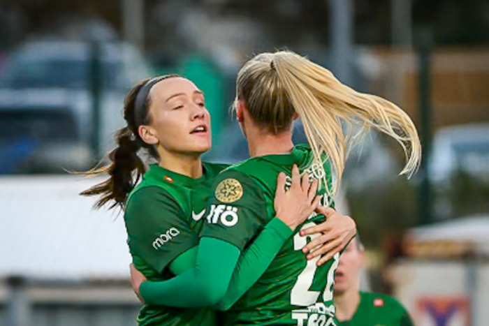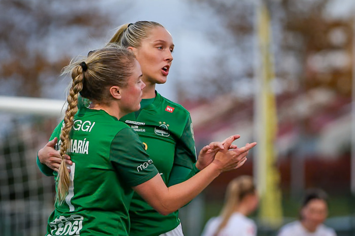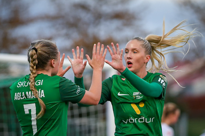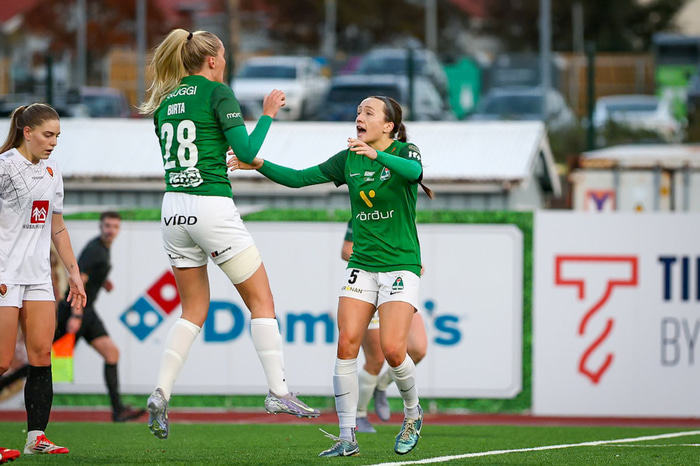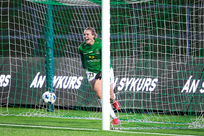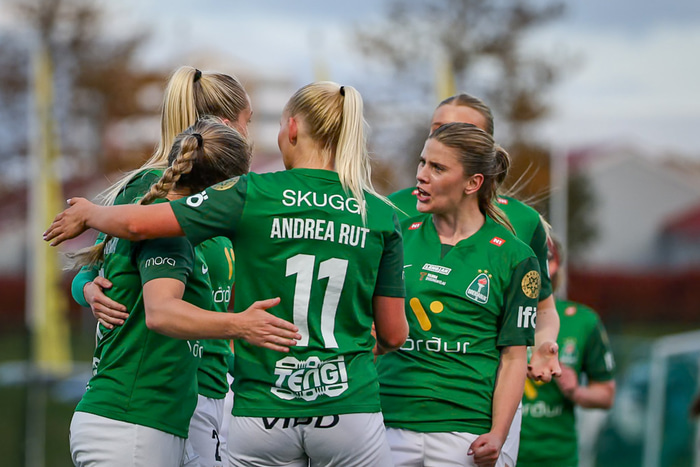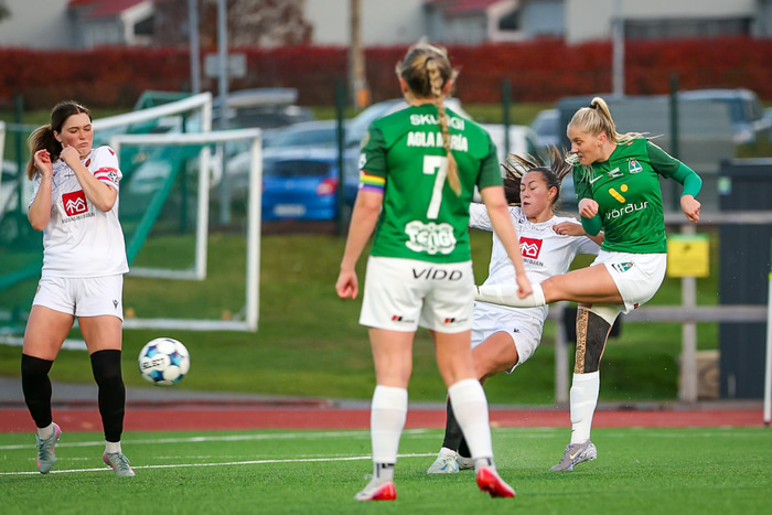 Varamennirnir Edith og Hrafnhildur Ása gera mjög vel. Ása komin í dauðafæri til að skora en setur boltann fram hjá markinu.