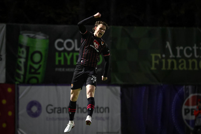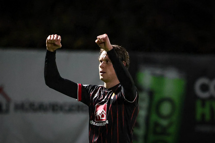 Hrikaleg mistök hjá Tómasi Orra sem fær boltann frá markmanni, hann snýr og veit ekki af Gylfa fyrir aftan hann sem er að koma í pressuna. Gylfi potar boltanum áfram á Valdimar sem er þá kominn í dauðafæri og klárar mjög vel!