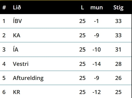 ÍBV er í öruggu sæti en það sem drífur þá áfram er eflaust baráttan um hinn eftirsótta Forsetabikar. Eyjamenn eru efstir í neðri hlutanum með jafn mörg stig og KA en betri markatölu.