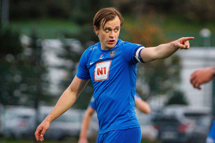 Halldór Snær, markvörður KR, fær sendingu til baka og er svellkaldur á boltanum. Bíður eftir pressunni og gefur á samherja rétt áður en að Oliver Heiðarsson nær að komast í boltann.