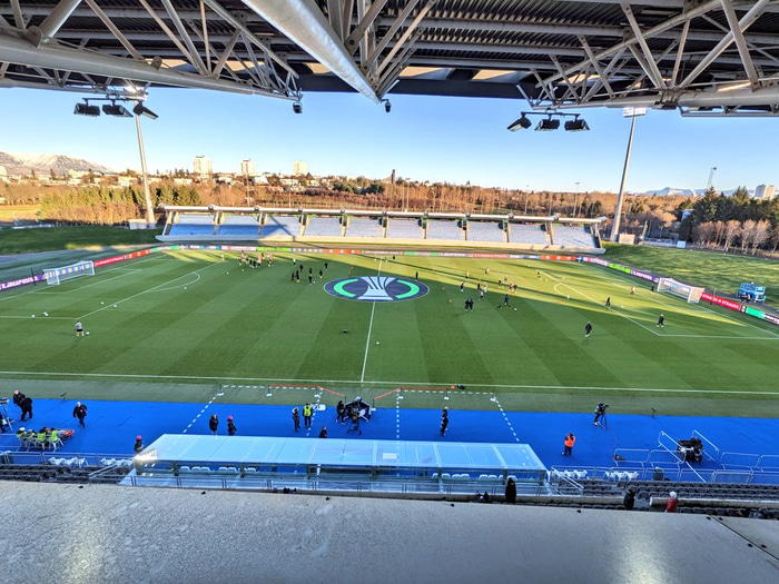 Iðagrænt hybrid gras Laugardalsvallar tekur á móti manni þennan októberdag. Framundan er leikur Breiðabliks og finnsku meistarana í Kuopion Palloseura í 2. umferð Sambandsdeildarinnar stórskemmtilegu.