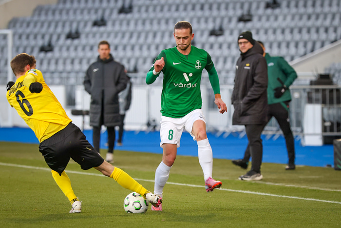 Valgeir Valgeirsson gerir frábærlega, kemur sér framhjá leikmanni KuPS og rennir boltanum fyrir en Tobias Thomsen hittir boltann illa og þetta endar með laflausu skoti. Þarna átti Daninn að gera miklu betur!