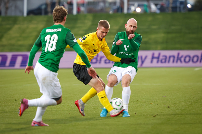 Stórhættuleg sókn Blika, Þorleifur reynir hælsendingu en Finnarnir koma boltanum frá. Þarna komust Blikar nálægt þessu...