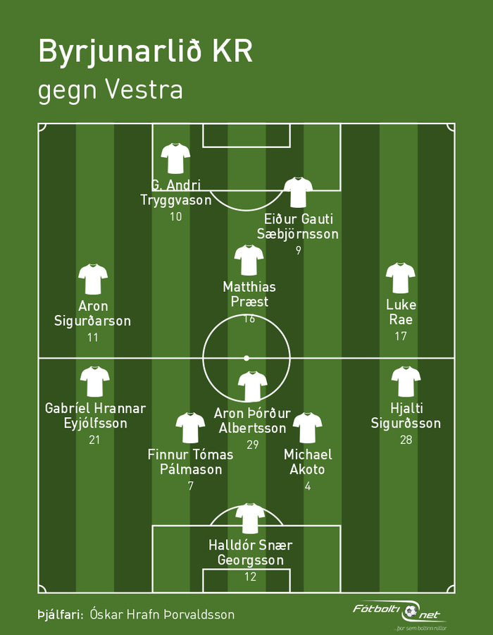 Alexander Helgi Sigurðarson tekur út leikbann í dag og er því ekki með KR í þessum leik. Þá eru þeir Sigurður Breki Kárason og Alexander Rafn Pálmason með U17 ára landsliðinu í Georgíu sem spilar þar tvo leiki í undankeppni EM. Þeir voru báðir í byrjunarliðinu í gær og Alexander kom að þremur mörkum í öruggum 5-1 sigri á heimamönnum.