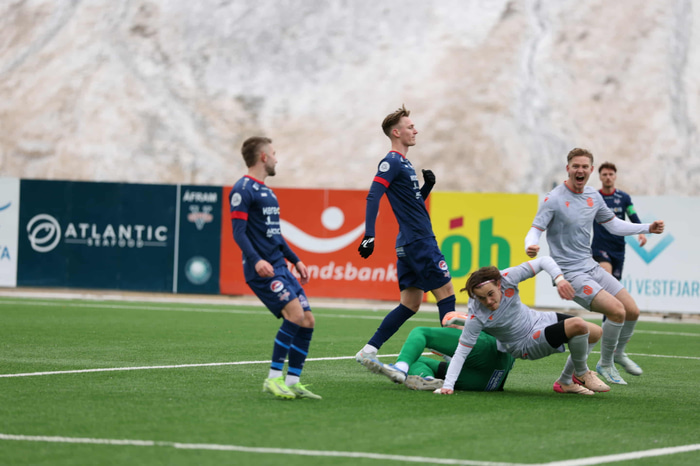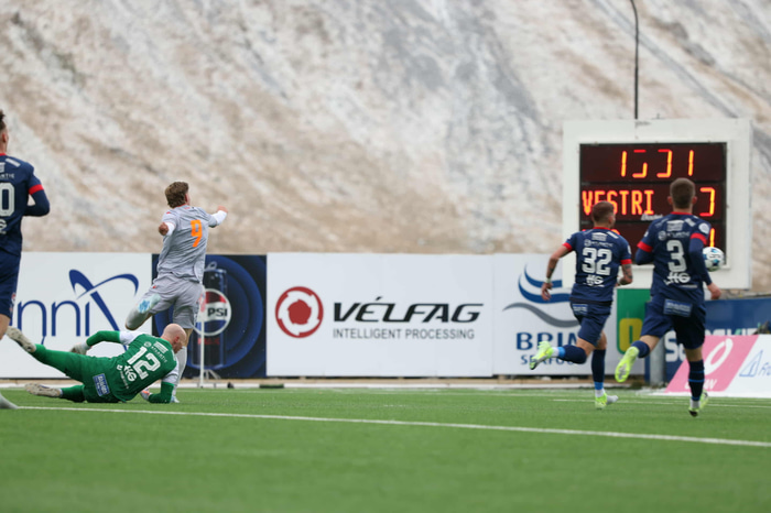 Túfa kemur boltanum í netið en Eðvarð lyftir flagginu.