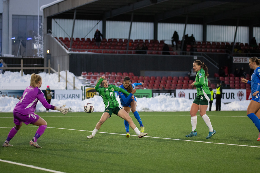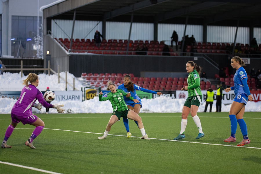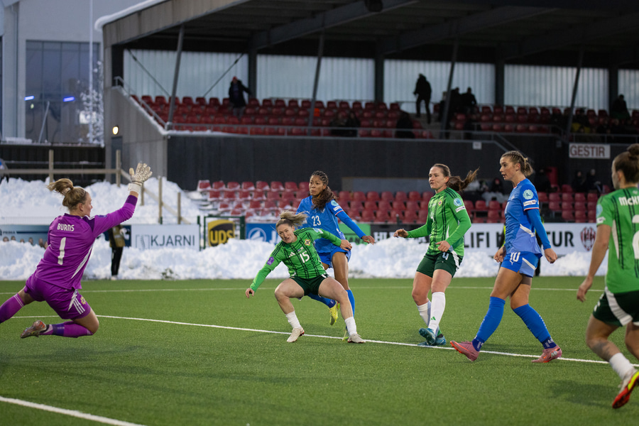 Norður-Írar fá sitt fyrsta horn í leiknum! Cecilía með hann í höndunum, missir hann svo en fleygir sér aftur á hann