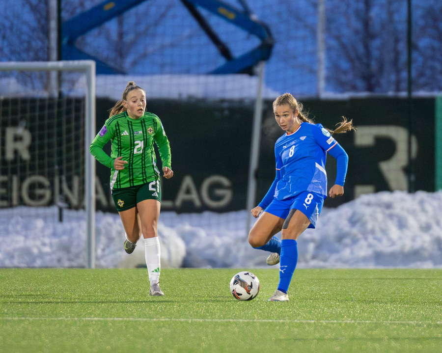 Hildur Antons kemst í góða stöðu og nær að setja boltann fyrir en þær Norður-Írsku ná að koma boltanum frá