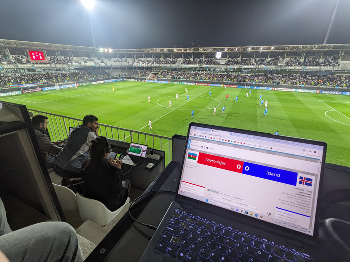 Valur Páll fer yfir málin i stúkunni í Baku
