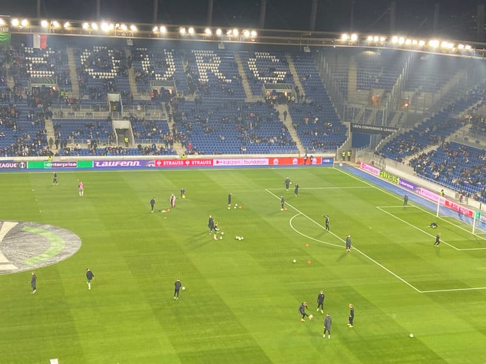Liðin eru úti að vellinum að hita upp. Þar sem ég sit sé ég ekki græna hafið, stuðningssveit Blika, en von er á um 40 Blikum á Stade de La Meinau í kvöld. Það er þokkalega vel mætt á leikinn og örugglega einn best sótti leikur sem Breiðablik hefur spilað.