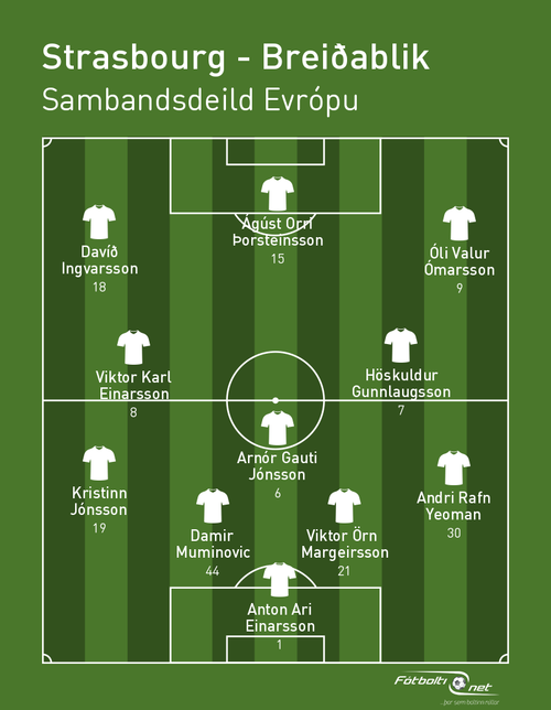 Breiðablik spilar í hvítum búningum og grænum stuttbuxum. Strasbourg er í bláum treyjum og hvítum stuttbuxum.
