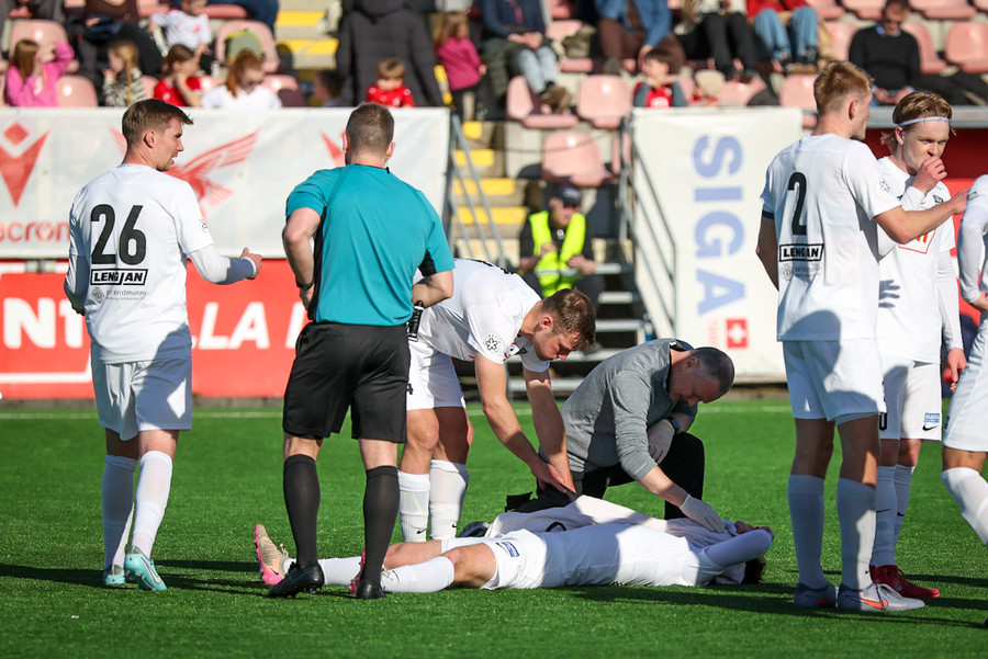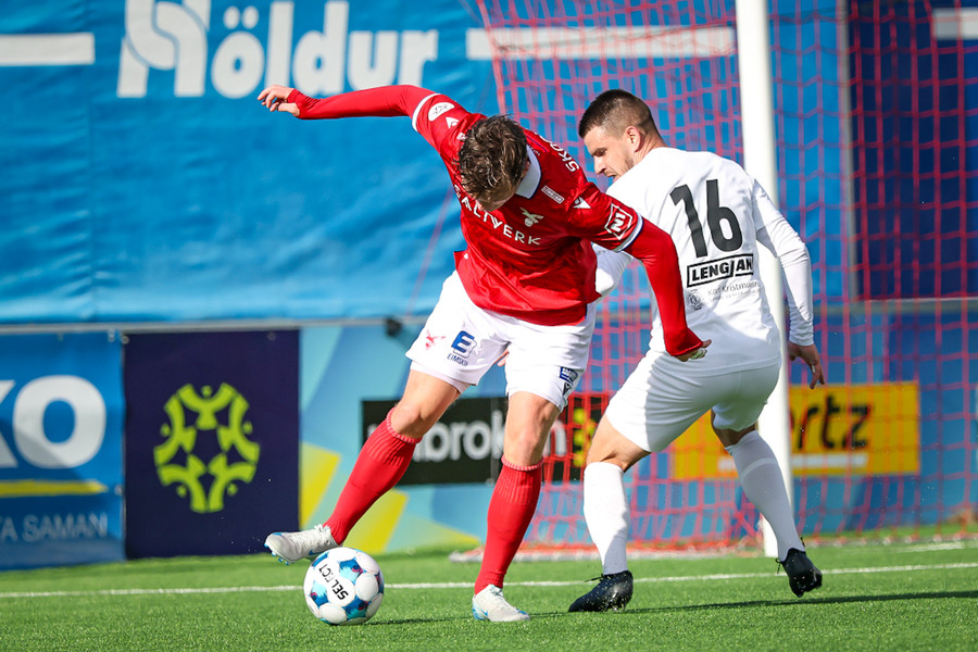 Bjarni Mark skallar hornspyrnu frá sem hrekkur til Felixar. Hann á skot með vinstri fyrir utan teig sem fer út við stöng.