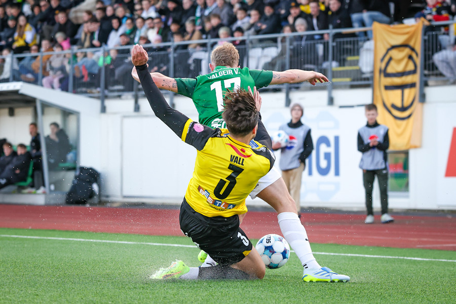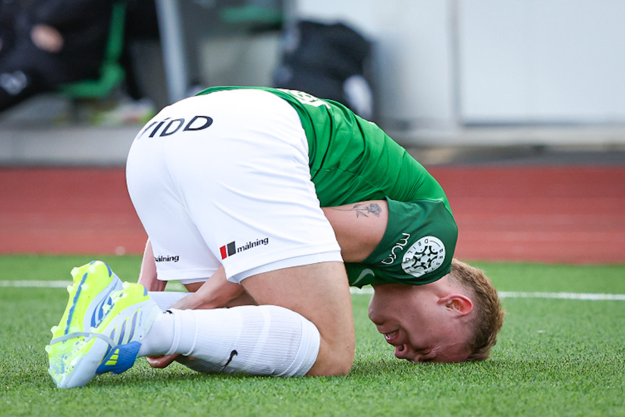 Rafael Máni fer í bókina eftir að hafa farið utan í Jónatan Guðna á sprettinum, Jónatan liggur eftir.