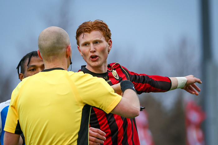Bjarki Hauks full ákafur í pressunni og rífur Viktor úr treyjunni. Fær réttilega gult spjald að launum. Fyrsta spjald kvöldsins litið dagsins ljós.