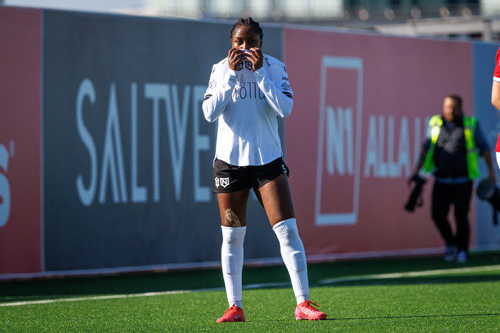Innkast frá Bríeti inn á teig þar sem Margrét fær boltann og á skot sem fer beint á Genevieve