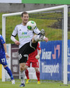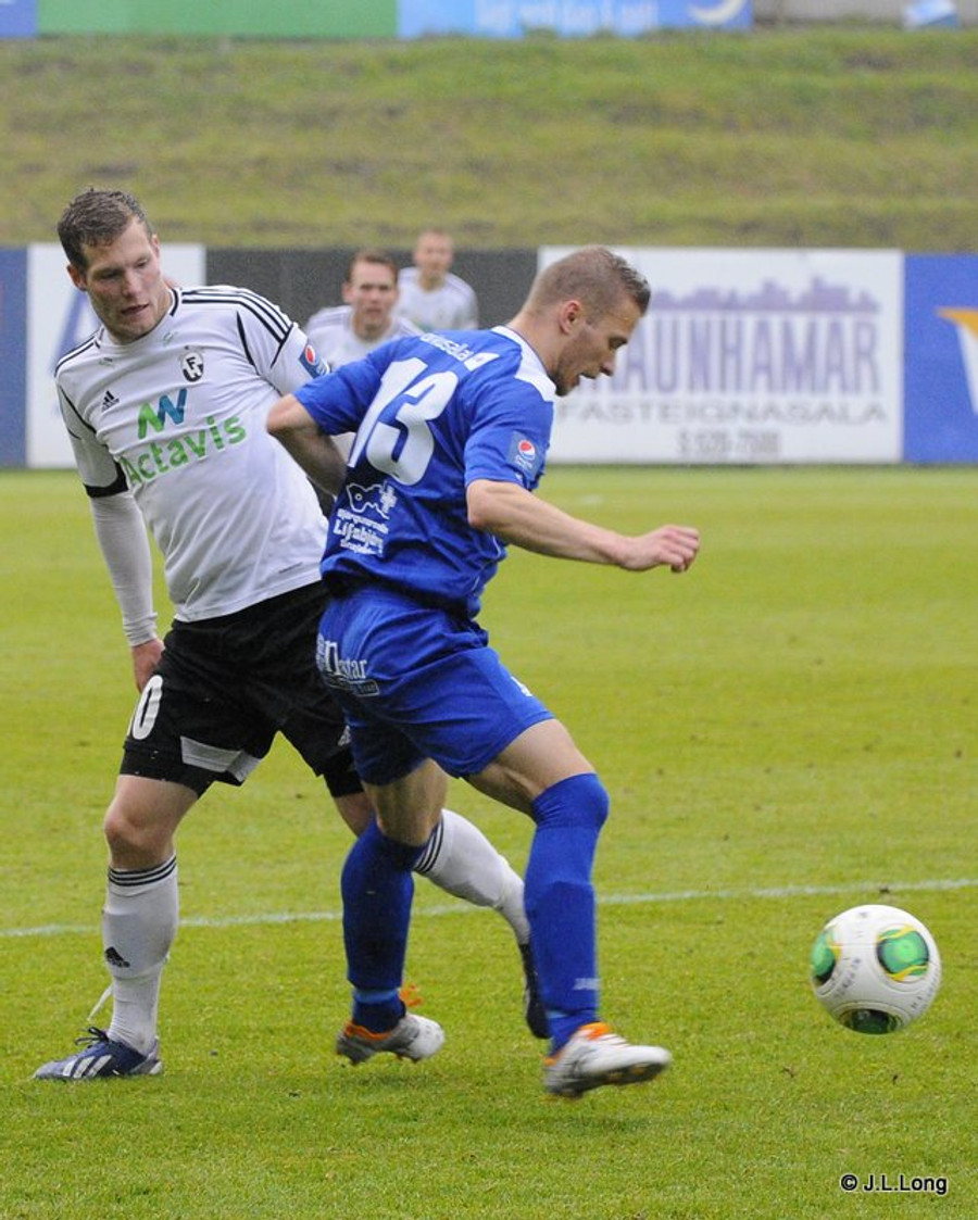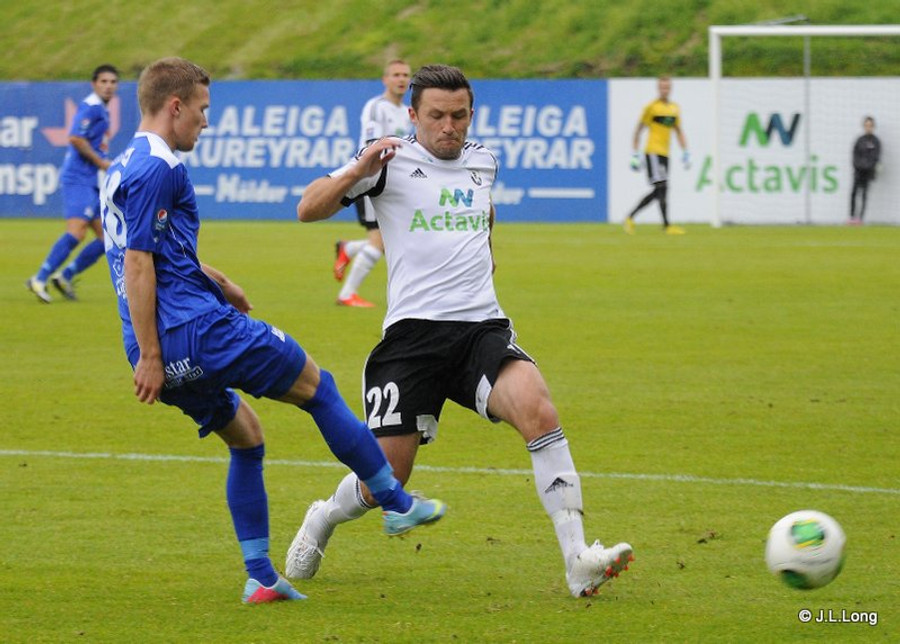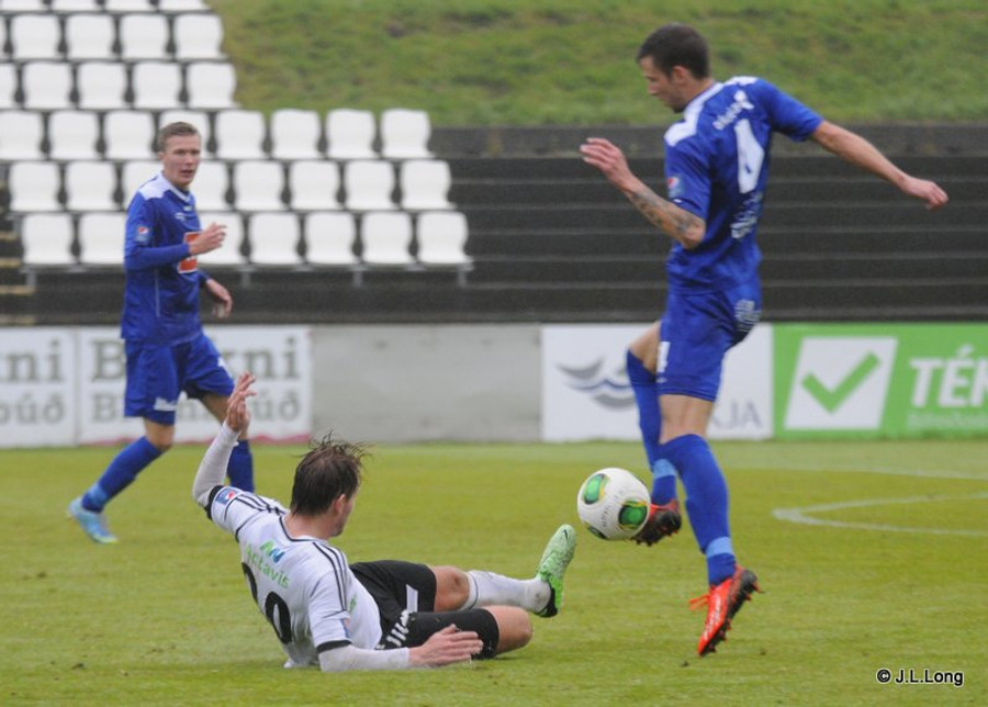 Juan Torres nálægt því að sleppa í gegn eftir langan bolta frá Alfreði. Einn besti leikmaður deildarinnar til þessa, Guðmann Þórisson, bjargaði að lokum með fínni tæklingu.