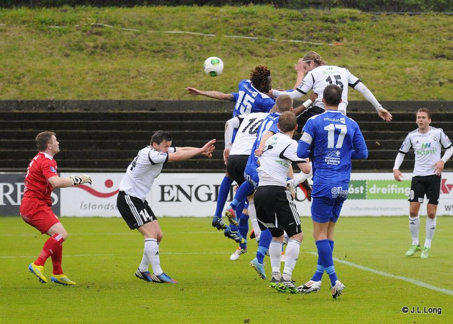 Björn Daníel og Einar Hjörleifsson lenda í samstuði eftir að Björn reyndi að skalla aukaspyrnu Ólafs. Björn lá eftir en er sem betur fer staðinn upp.