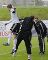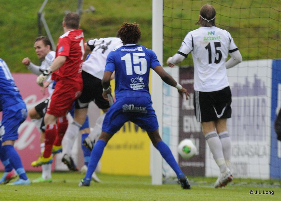 Björn Daníel skorar með skalla eftir hornspyrnu Sam Tillen. Það er spurning hvort að Pétur Viðars hafi skallað hann á Björn en sem stendur fær Tillen stoðsendinguna.