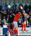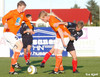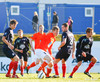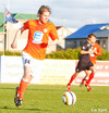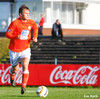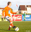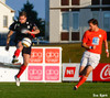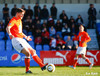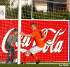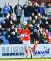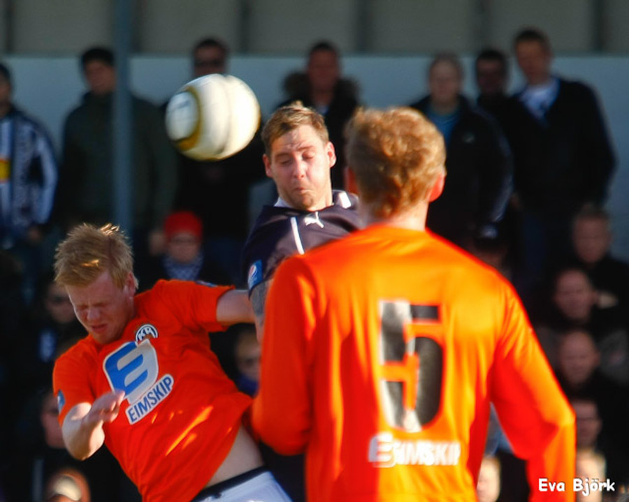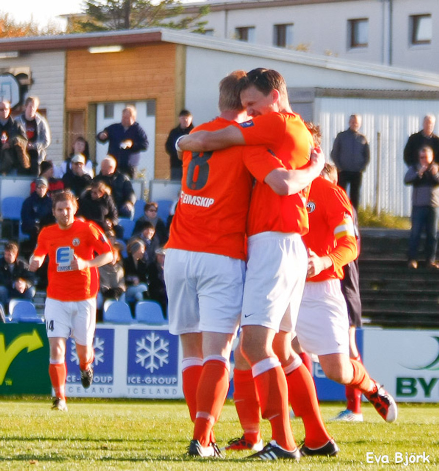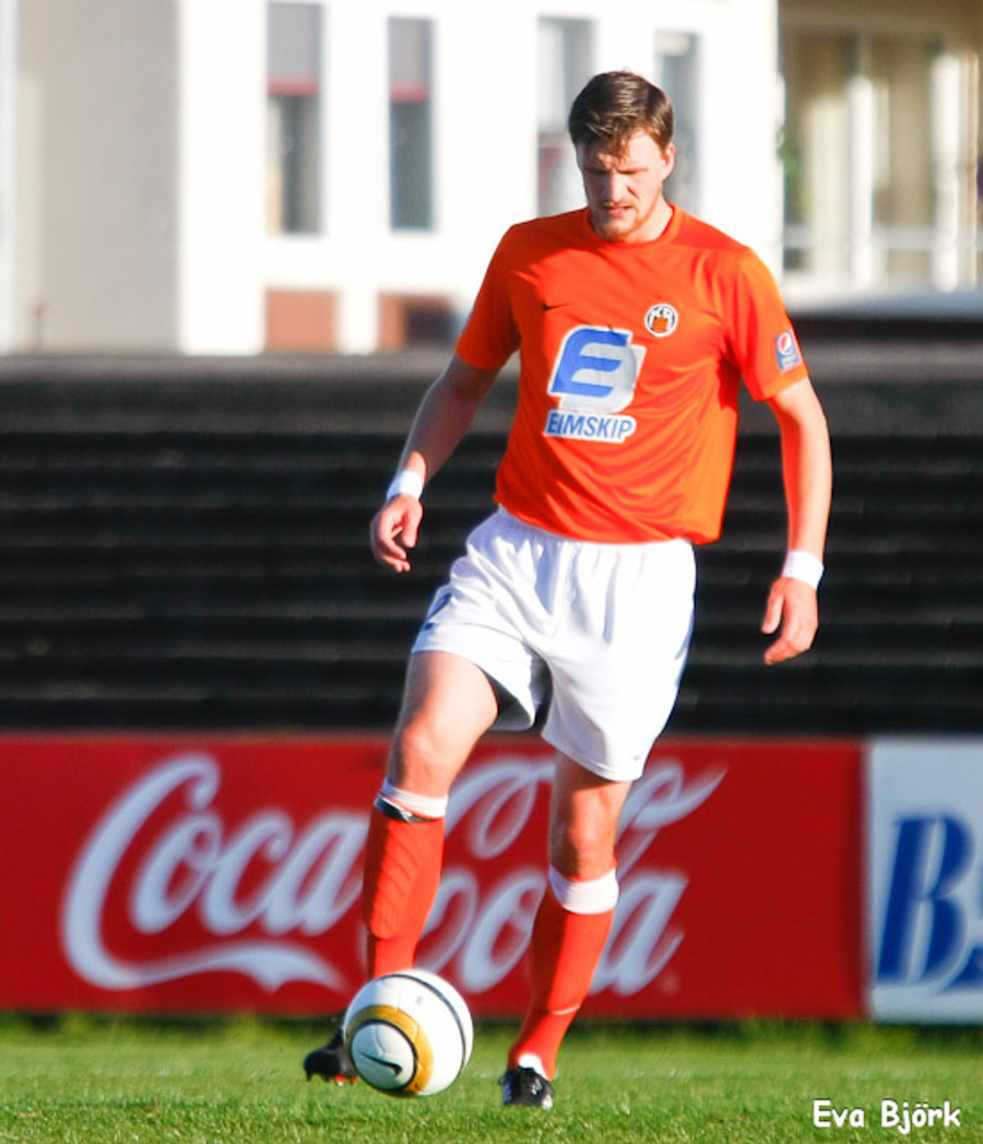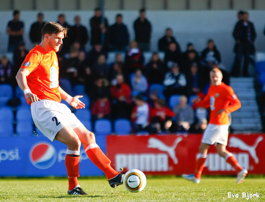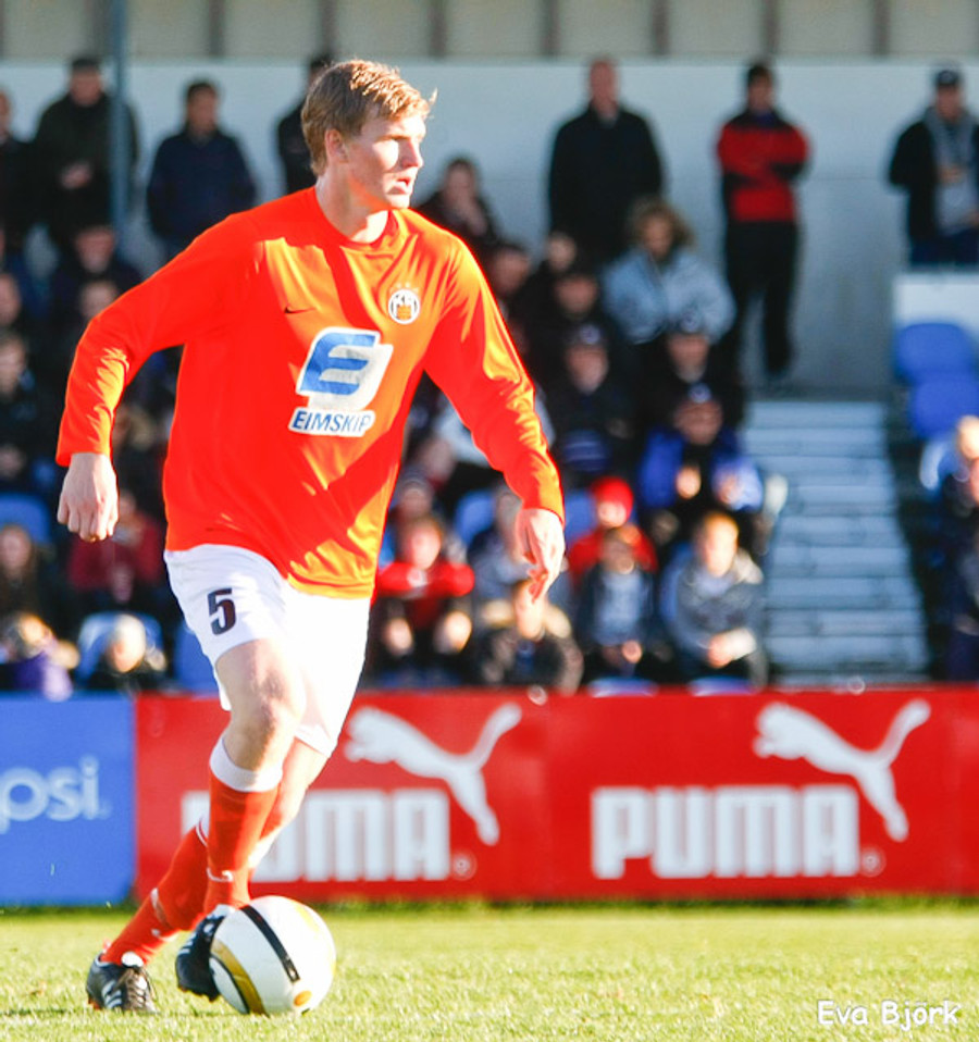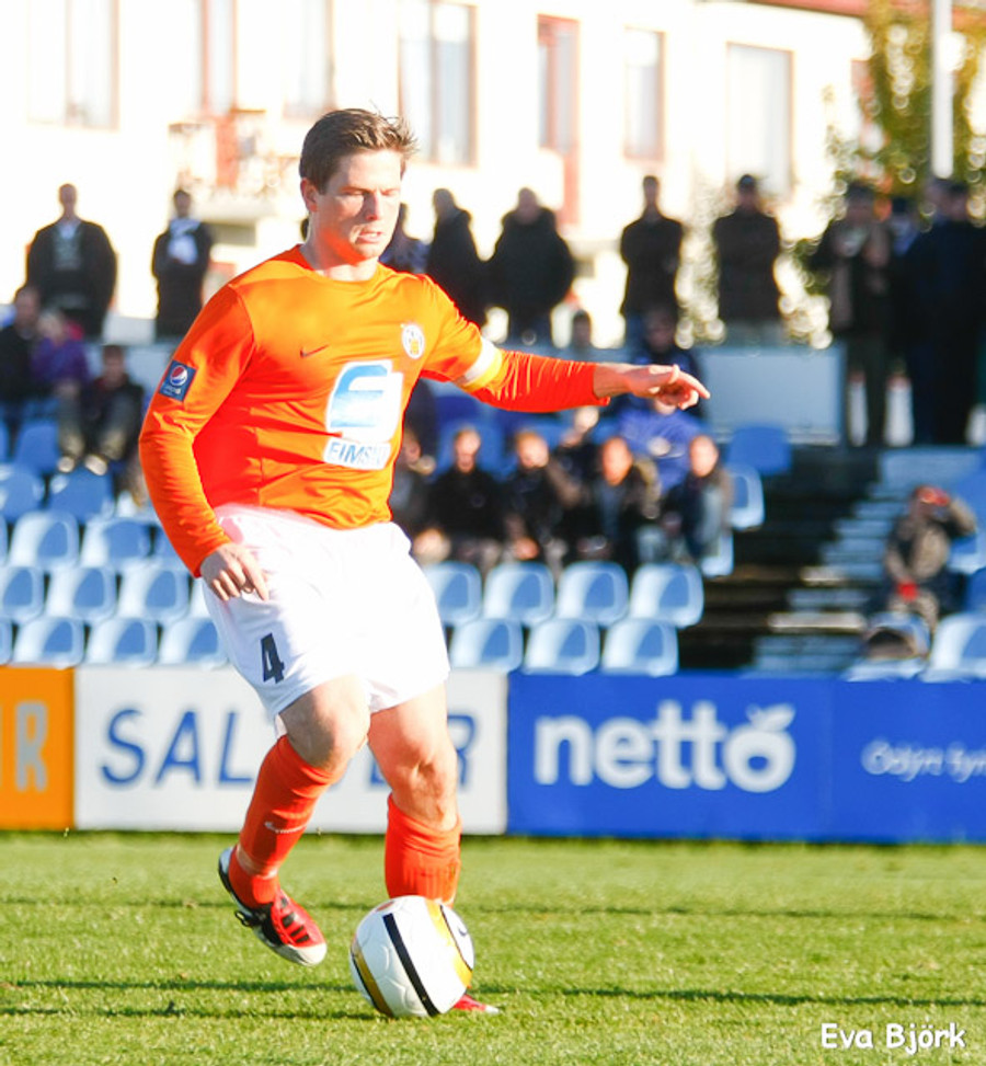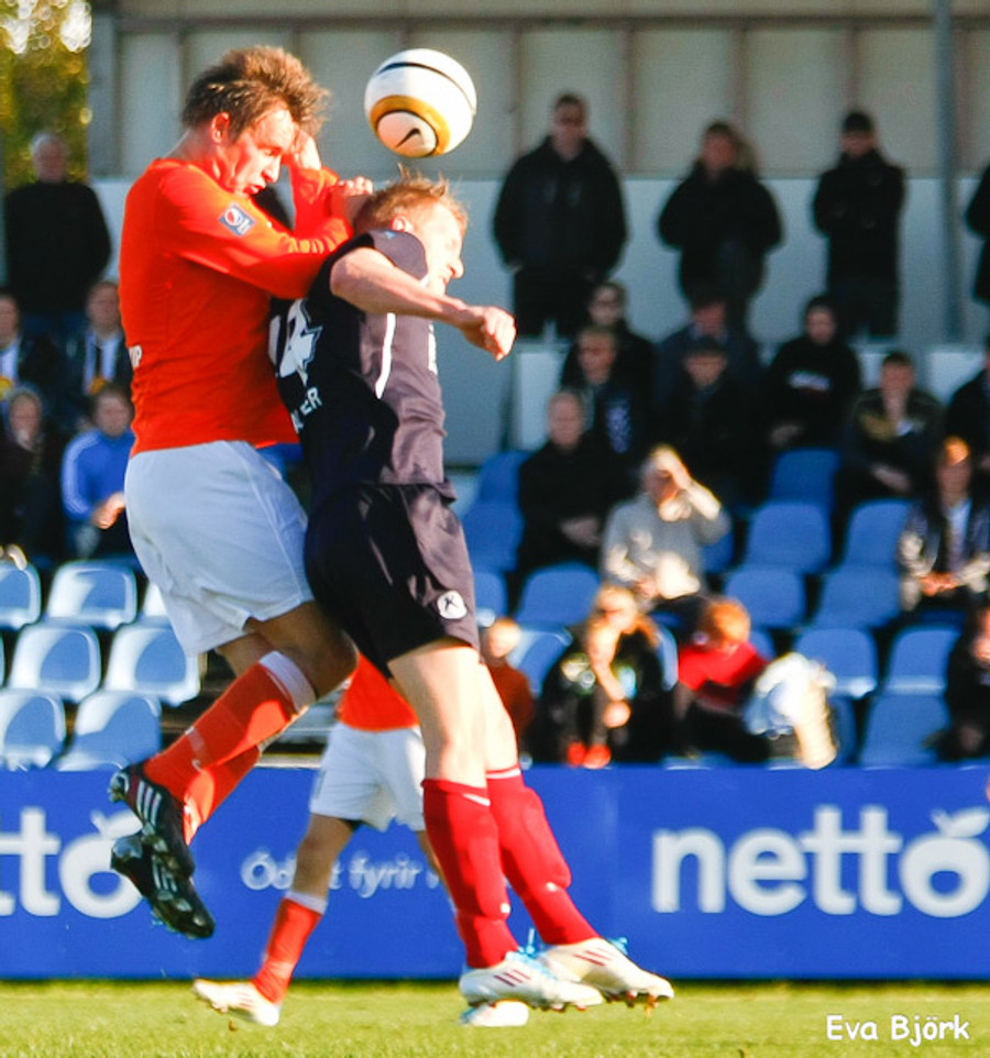 Bjarni Guðjónsson reynir skot úr aukaspyrnu utan af vinstri kanti en boltinn fer yfir.