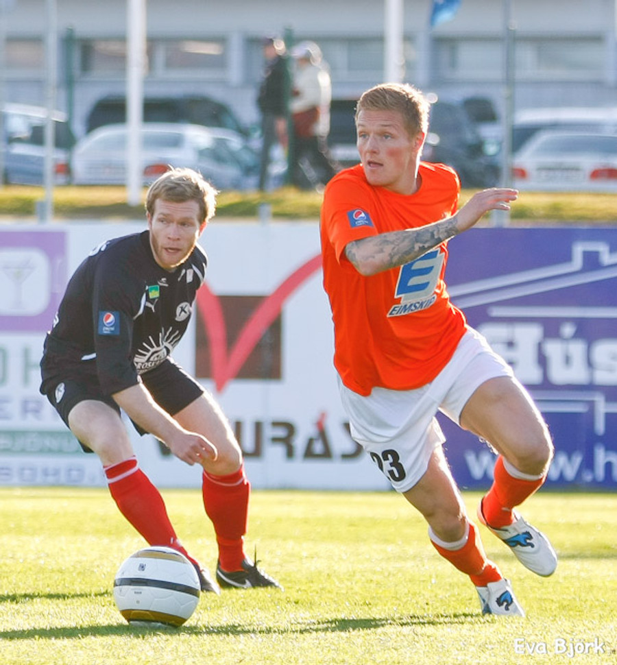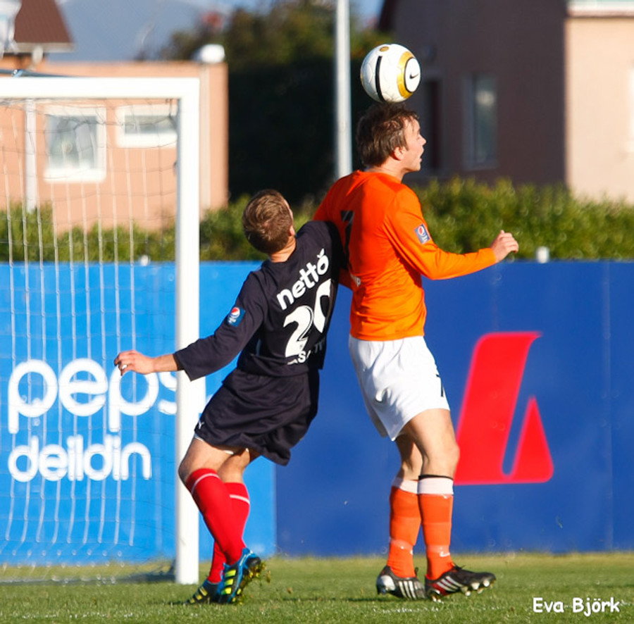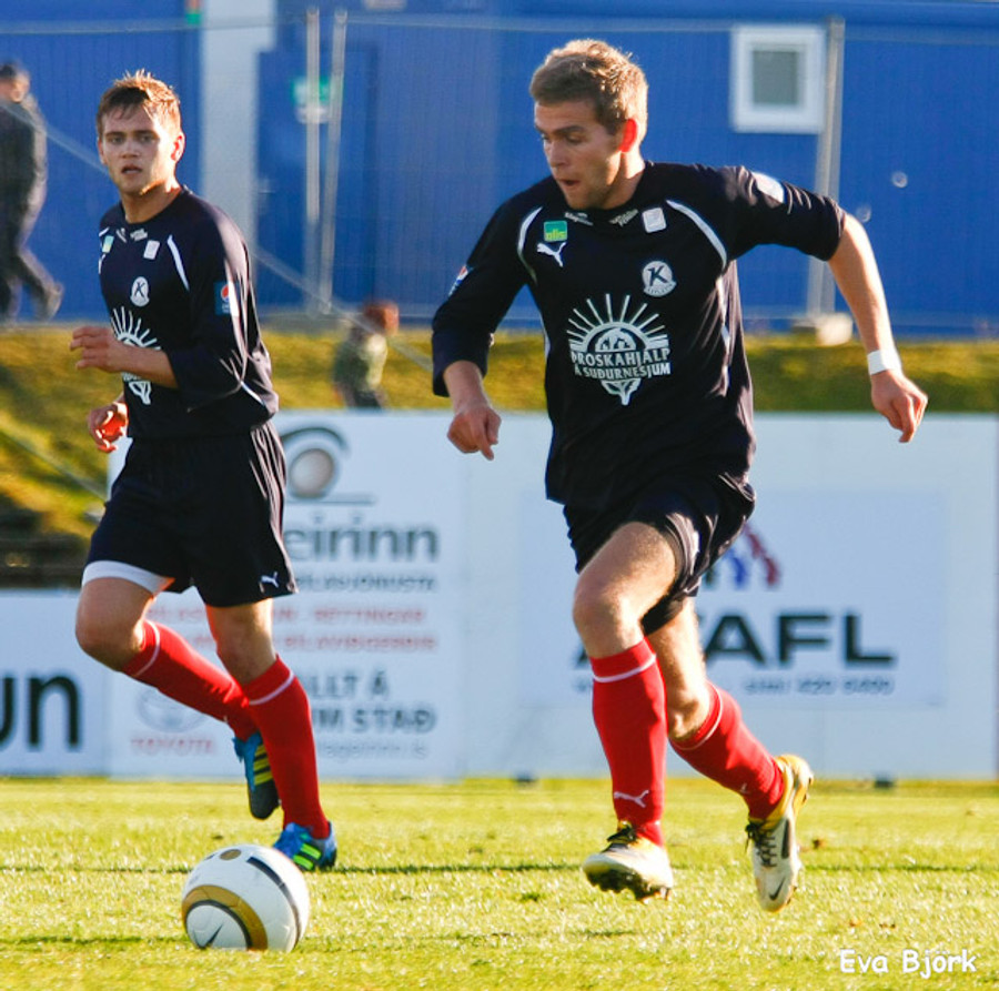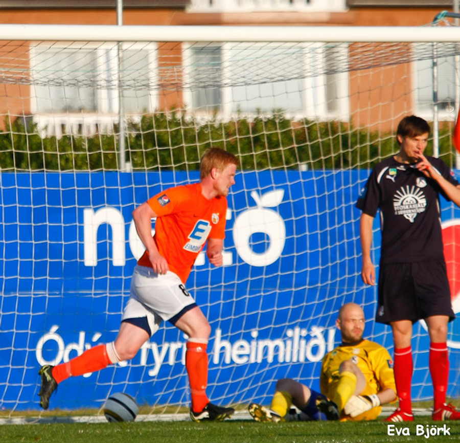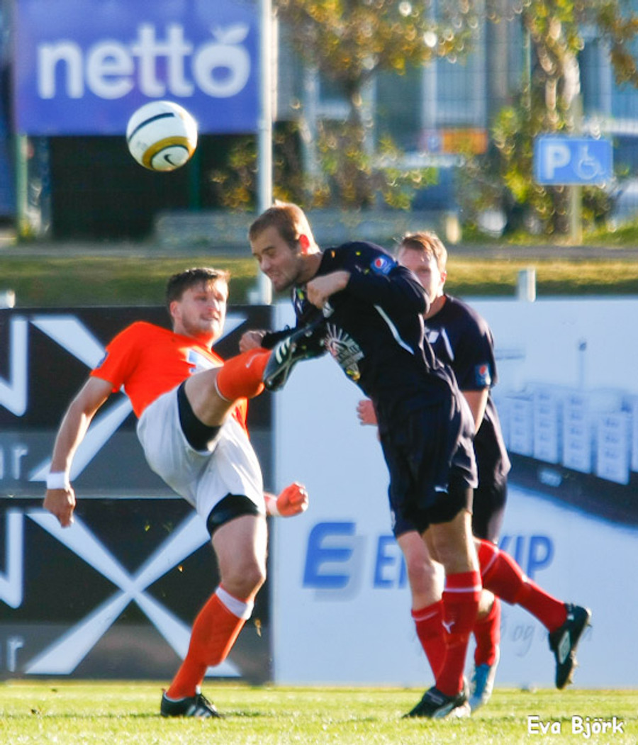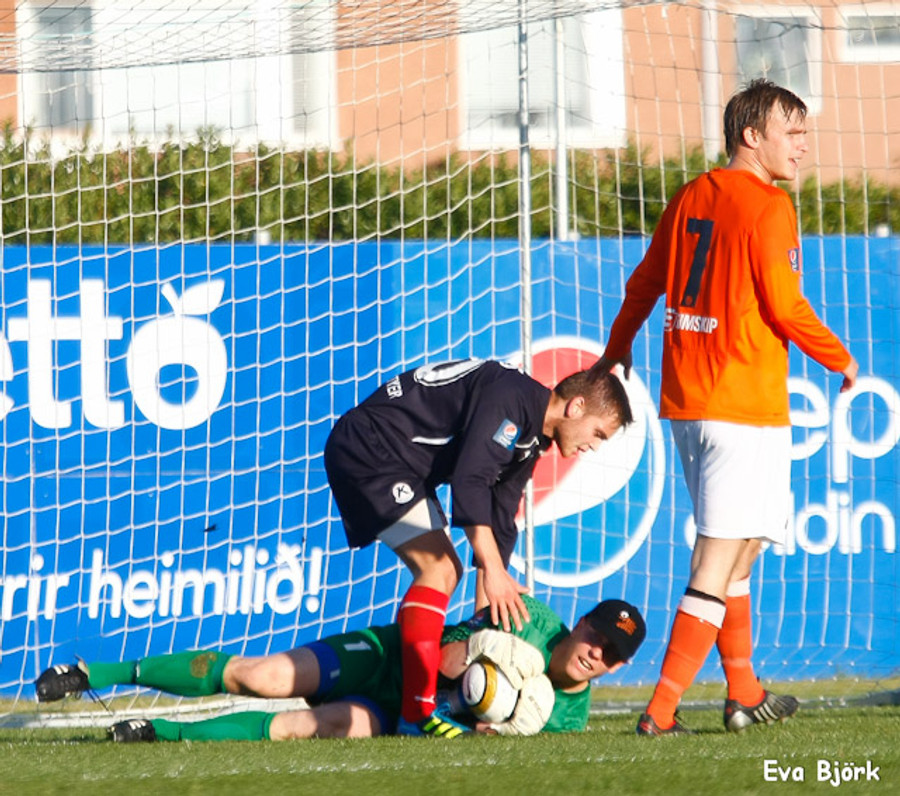 Guðmundur Steinarsson fær fínt skotfæri eftir undirbúning frá Hilmari Geir Eiðssyni en skot hans fer langt framhjá.