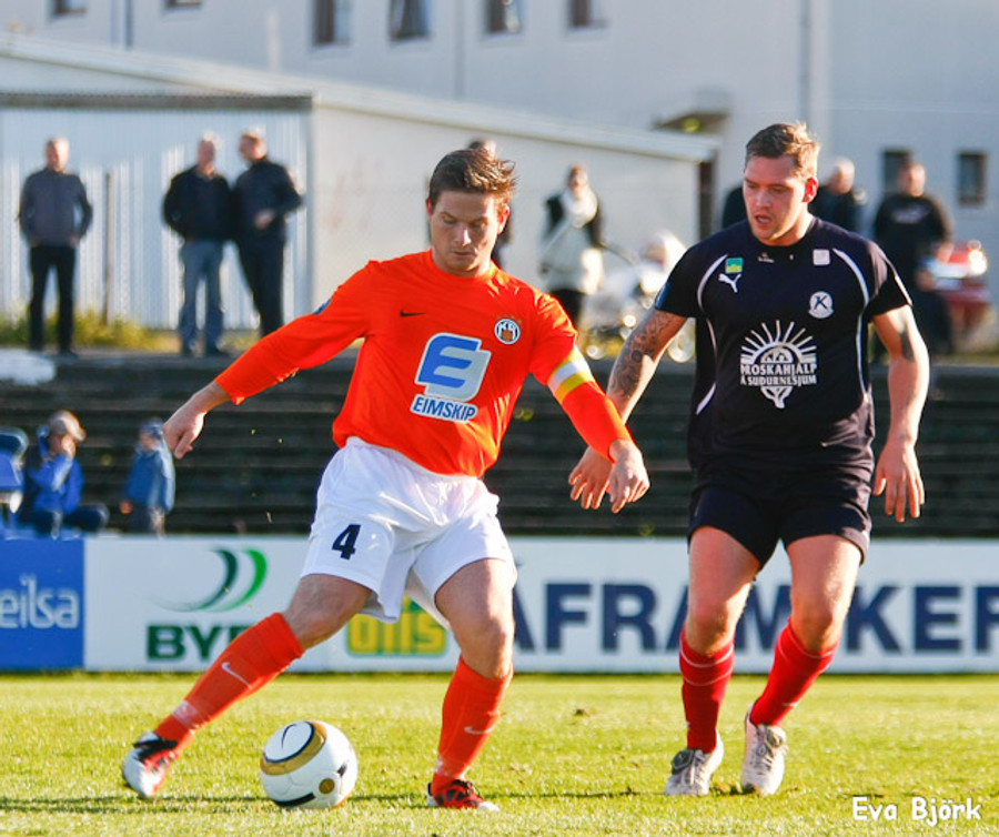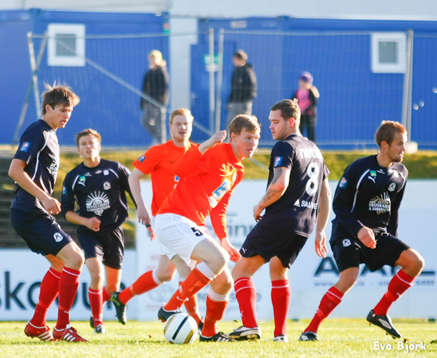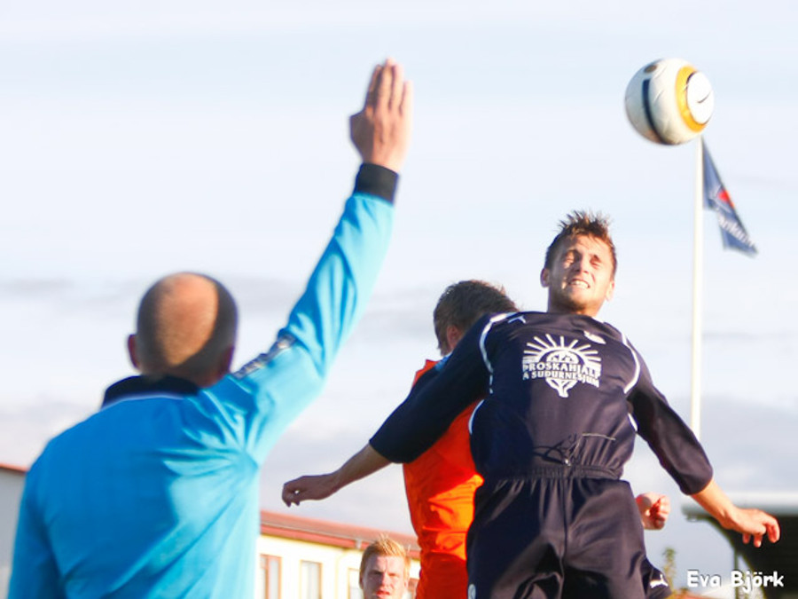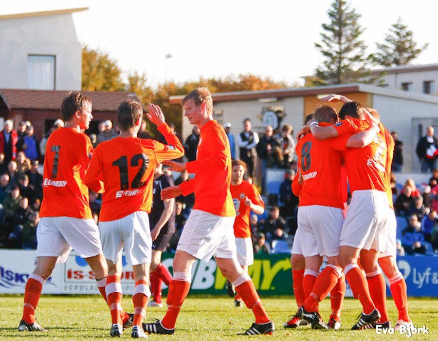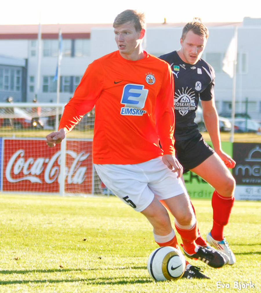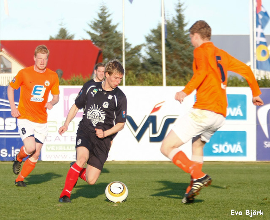 Guðmundur Steinarsson fær fínt skotfæri eftir undirbúning frá Hilmari Geir Eiðssyni en skot hans fer langt framhjá.