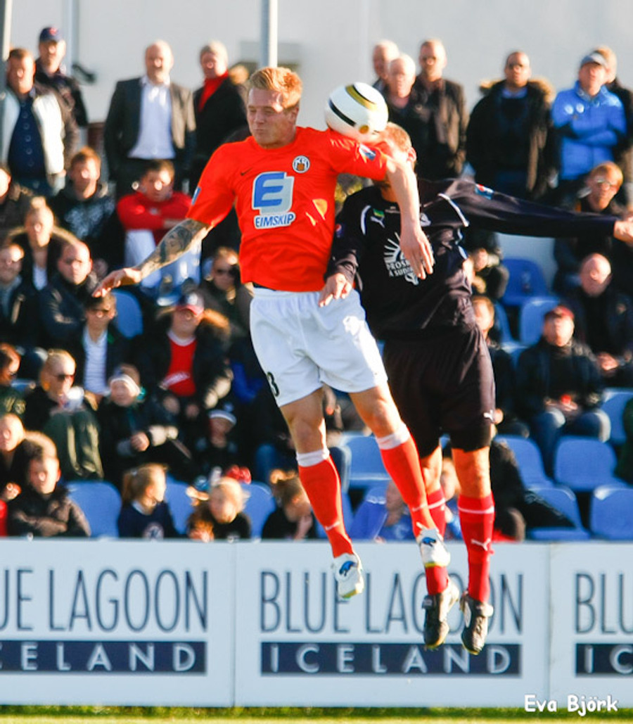 Guðmundur Steinarsson hleður í skot fyrir utan vítateig en Hannes Þór Halldórsson, sem er með derhúfu í markinu, ver af öryggi.