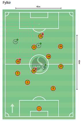 Ekkert óhefðbundið var við uppstillingu Fylkismanna. Einfalt leikkerfi með skýrt afmörkuðum hlutverkum varnarlega, 4-1-4-1. Liðið virtist helst leita að löngum boltum frá vinstri vængnum yfir á hægri kantmanninn Parfitt-Williams. Úrvinnslan úr þeirri stöðu var óljós en þó ljóst að hann er góður leikmaður.