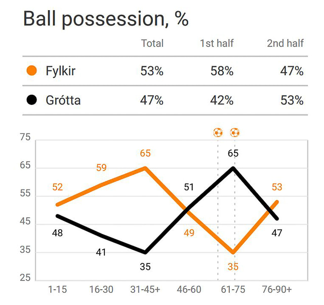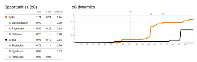 Það vildi síðan þannig til að það var hættulegasti kafli Gróttu í leiknum. Þeir fengu fjórar mjög hættulegar stöður í vítateig Fylkismanna á fimm mínútna kafla þar sem þá skorti sennillega sambland af reynslu/yfirvegun/gæðum til að nýta stöðurnar. Þá sést líka hversu gölluð tölfræðin getur verið séu atvik rangt skráð. Ef leikmaður nær að skjóta að marki færist það til bókar sem vænt mark (XG) og engin af þessum stöðum sem um ræðir er skráð sem tilraun að marki Fylkis. Þrátt fyrir að boltinn fari í varnarmann á ögurstundu í þrígang.