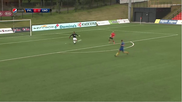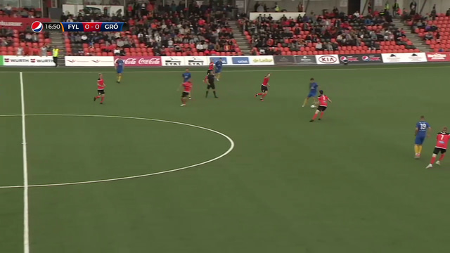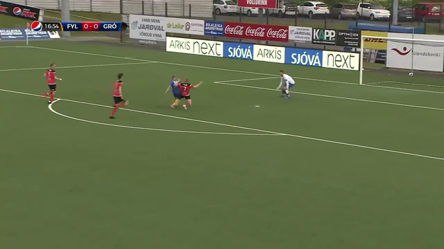 - Eftir óhreint uppspil Fylkis á 17 mínútu vinna Gróttumenn boltann og sennilega er sending á Pétur misheppnuð sem skapar misskilning milli Helga Vals og Orra og boltinn berst til Kristófers.