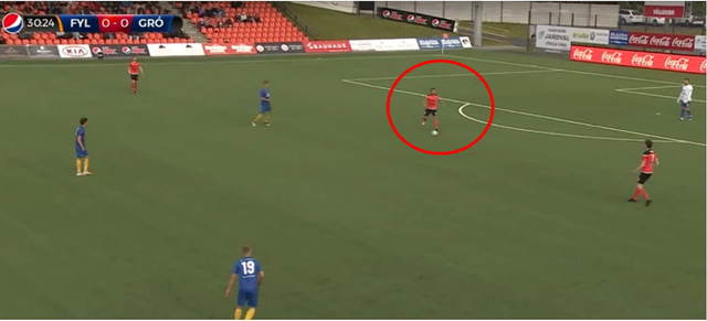 Þetta var augljóslega búið að æfa nokkuð vel. Nokkrum sinnum féll hann niður á milli hafsentana sem gátu þá borið boltann upp. Sem var fín lausn gegn pressu Gróttumanna. Einkum Ásgeir sem kom svo með langan bolta horn í horn á PW sem var ætlað að skapa út frá því.