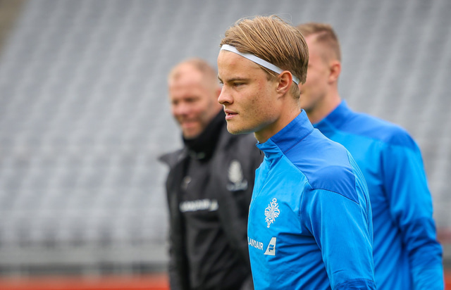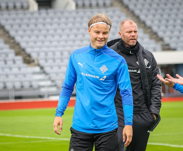 Sóknarmaðurinn Andri Lucas Guðjohnsen mætti í fyrsta sinn á æfingu hjá A-landsliði karla í gær.