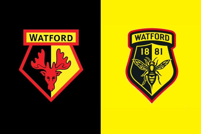 Hér að neðan má sjá núverandi merki Watford til vinstri og merkið sem gæti tekið við til hægri. Elgur er í núverandi merki en geitungur í nýja merkinu.