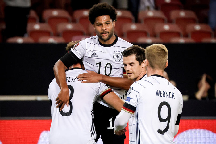 Serge Gnabry kom Þjóðverjum yfir með skalla eftir fyrirgjöf frá David Raum. Spánverjar hermdu eftir því og Alvaro Morata skallaði boltann í netið eftir fyrirgjöf frá Cesar Azpilicueta.