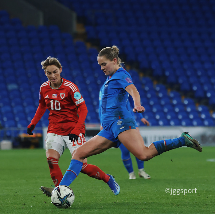 Hildur Antonsdóttir skoraði sitt fyrsta landsliðsmark þegar hún kom Íslandi í 1-0 af harðfylgi í 2-1 sigri Íslands á Wales í Þjóðardeild Evrópu í kvöld. Sigur sem tryggði Íslandi sæti í umspili um áframhaldandi veru í A-deild og mikilvægið eftir því.