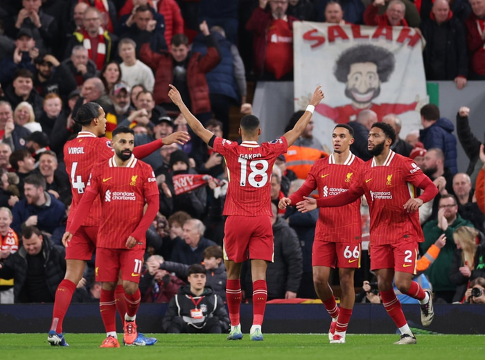 Liverpool kom af miklum krafti inn í leikinn og óð í færum. Það var svo eftir 12 mínútna leik sem Mohamed Salah átti fyrirgjöf og Cody Gakpo stýrði boltanum í netið af stuttu færi.
