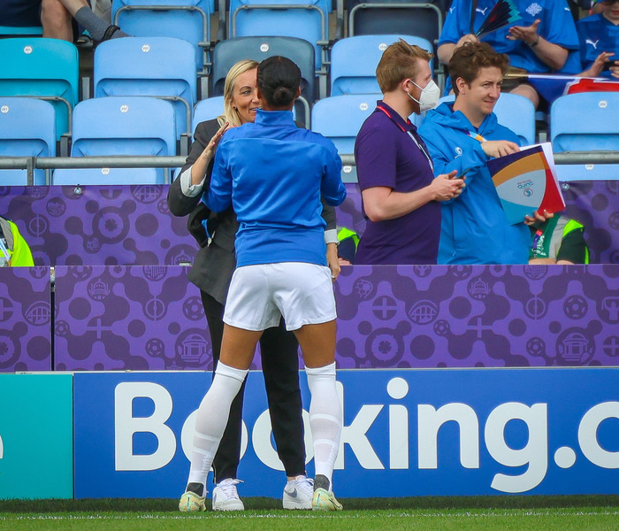 „Ég held að hún sé á frábærum stað í Wolfsburg. Þar er verið að aga hana til og kenna henni meira taktískt. Ef við tökum ekki frá henni tilfinninguna fyrir því sem hún trúir á þegar hún er með boltann þá verður hún best í heimi í sinni stöðu. Hún er það góð. Hún þarf kannski að bæta það aðeins að skora með skalla. Það er engin sem hoppar hærra en hún. Ef hún getur unnið í því að skalla þessa bolta inn, þá verður hún gjörsamlega óstöðvandi," segir Elísabet.