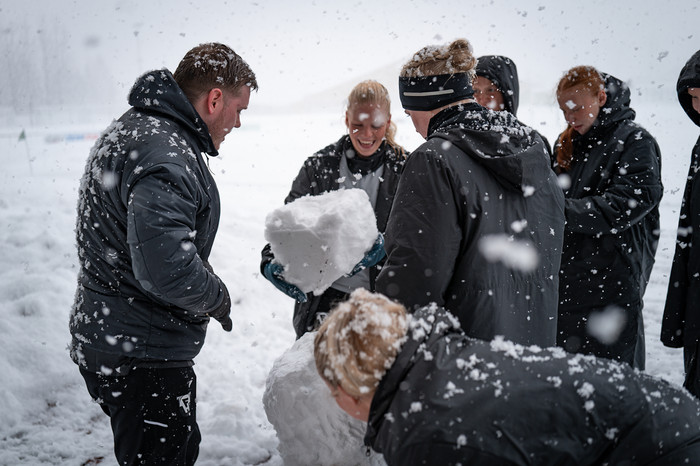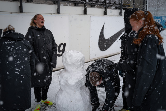 Aðstæður á Kópavogsvelli eru mjög erfiðar, völlurinn er snævi þakinn og það snjóar mikið.