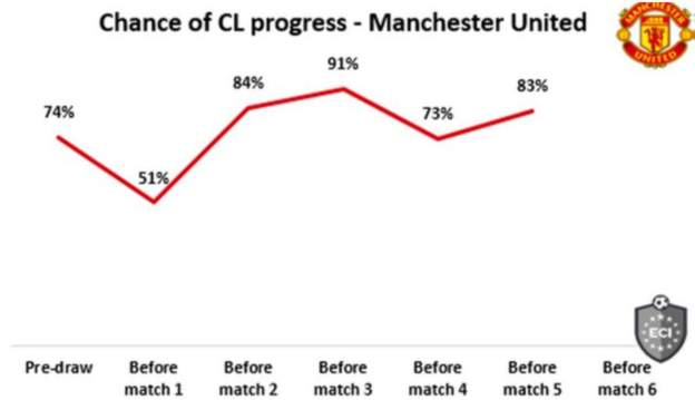 Tölfræðifyrirtækið Gracenote hefur reiknað út að United eigi 83% möguleika á því að komst í útsláttarkeppni Meistaradeildarinnar.