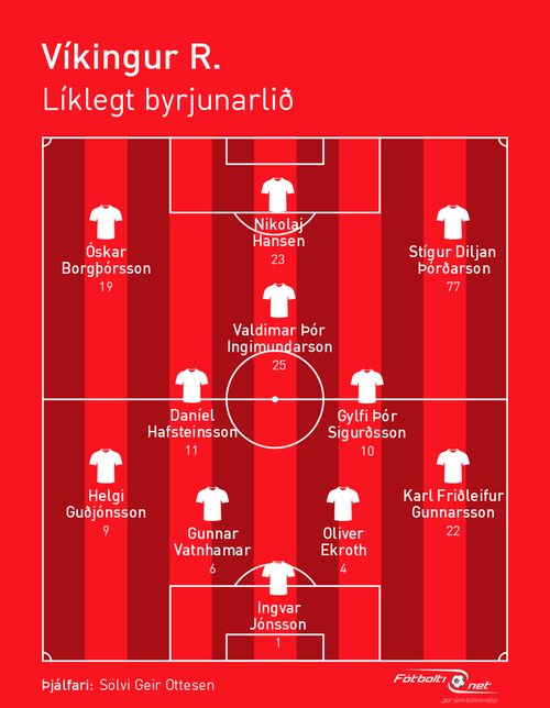 Veikleikar: Það er erfitt að segja. Víkingar misstu mikla reynslu í vetur þegar Matthías Vilhjálmsson lagði skóna á hilluna og Pablo Punyed fór í Hauka. Báðir voru þeir mikilvægir fyrir leikmannahópinn en aðrir leikmenn ættu að geta tekið við keflinu af þeim. Ingvar Jónsson átti ekki sitt besta tímabil í markinu í fyrra, allavega ekki samkvæmt tölfræðinni, og hann þarf að stíga meira upp í sumar. Aron Snær Friðriksson er mættur til að veita honum samkeppni. Elías Már Ómarsson kom frá Kína í vetur og hann á leiða sóknarlínuna en heyrst hefur að hann sé ekki í besta forminu. Nikolaj Hansen er líka til staðar en hann er orðinn 33 ára. Kannski verður níustaðan því smá vandamál ef Elías finnur ekki fjölina. Það er þó eins og áður segir erfitt að finna einhverja veikleika fyrir þetta lið.