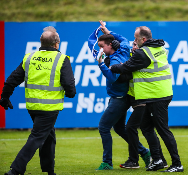 Tveir stuðningsmenn Stjörnunnar stukku úr stúkunni eftir að Hilmar Árni Halldórsson skoraði sigurmarkið seint í leiknum. Tómas Meyer og félagar í gæslunni voru þó snöggir að bregðast við.
