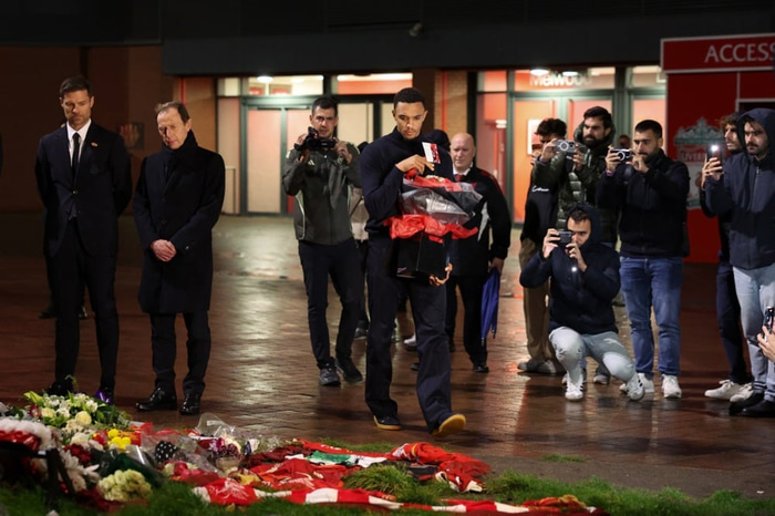 Hann ásamt Xabi Alonso, Dean Huijsen og Emilio Butragueno, stjórnarmaður hjá félaginu, heimsóttu Anfield í dag og vottuðu Diogo Jota og Andre Silva viðringu sína en bræðurnir létust í bílslysi í sumar.
