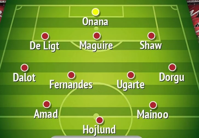 (3-4-2-1) Onana; De Ligt, Maguire, Shaw; Dalot, Fernandes, Ugarte, Dorgu; Amad, Mainoo; Höjlund