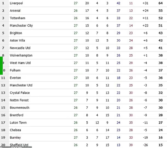| 7 | Liverpool | 9 | 5 | 0 | 4 | 16 | 14 | +2 | 15 |