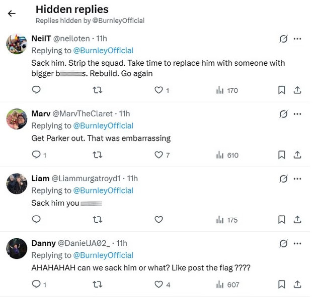 Burnley ákvað að 'fela' ummæli á X samfélagsmiðlinum þar sem kallað er eftir því að Scott Parker verði rekinn.