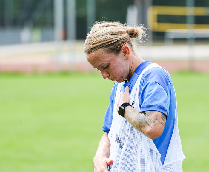 „Sara er búin að vera fyrirliði. Ég fékk þann heiður að bera það á meðan hún var í burtu. Ég vissi að þetta væri staðan. Hún er búin að vera fyrirliði í landsliðinu og er geggjaður leiðtogi. Ég mun alltaf gefa henni bandið. Hún er frábær leiðtogi, geggjaður leikmaður og á þetta skilið.”