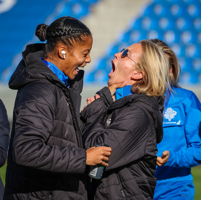 Það hefur verið fyndið að fylgjast með Gunnhildi og Sveindísi Jane Jónsdóttur upp á síðkastið en þær hafa tekist mikið á - allt auðvitað í léttum gír. Þær hafa verið að skemmta sér vel þegar myndavélin er á lofti og boðið upp á áhugaverðan leikþátt.