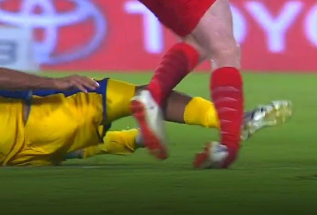 Aron lenti í slæmri tæklingu undir lok leiksins og þurfti að kalla inn bíl til þess að koma Aroni út af. Þetta leit ekki vel út.