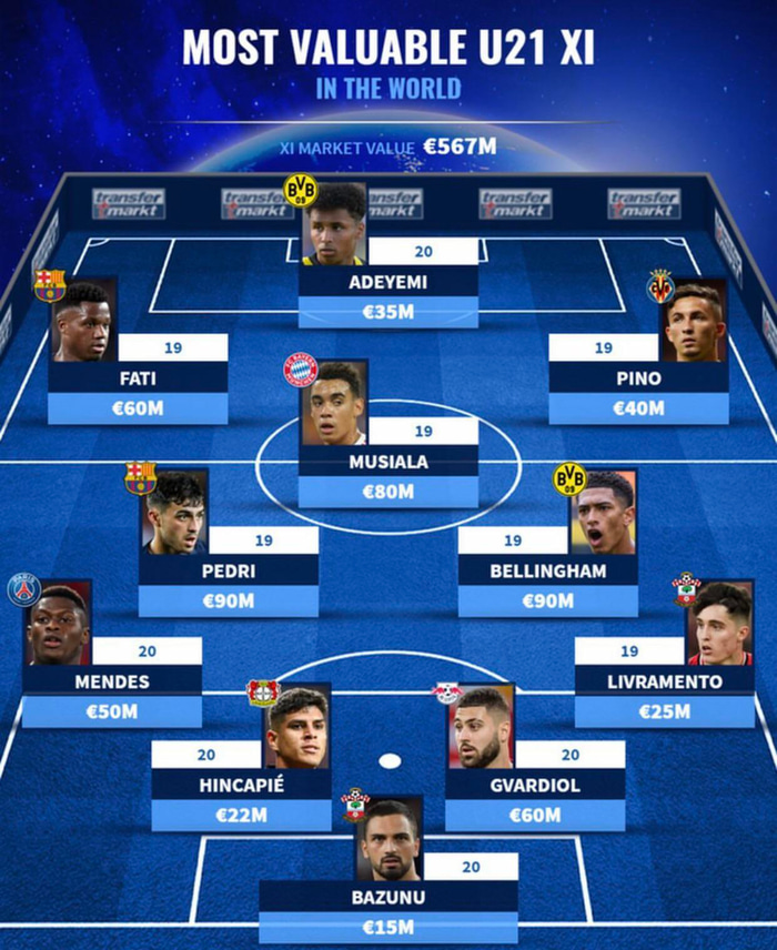 Vefsíðan transfermarkt heldur uppi alskonar áhugaverðum upplýsingum úr fótboltaheiminum og er búið að taka saman verðmætasta byrjunarlið leikmanna sem eru 20 ára og yngri.