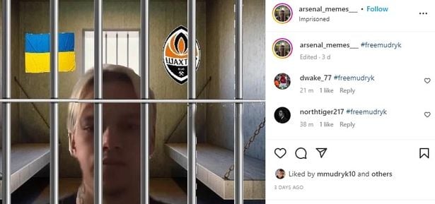 Aðgangurinn 'Arsenal memes' setti inn mynd sem sýndi Mudryk bak við lás og slá með úkraínska fánann og liðsmerki Shaktar sitthvorum megin við sig. Við myndina er kassamerkið #freemudryk.