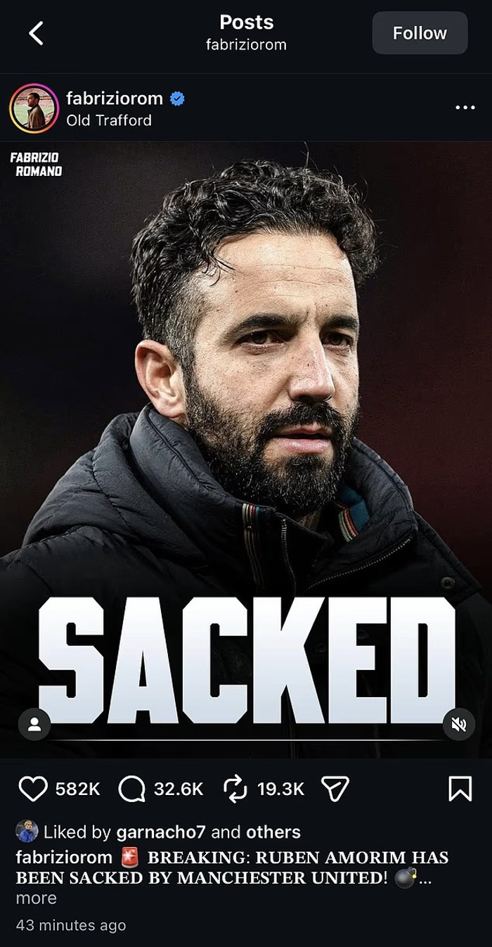 Fótboltafréttamaðurinn Fabrizio Romano greindi frá því á Instagram í morgun að Amorim væri búinn að taka pokann sinn og Garnacho er meðal þeirra sem hafa sætt 'læk' við þá færslu. Hann er ánægður með tíðindin.